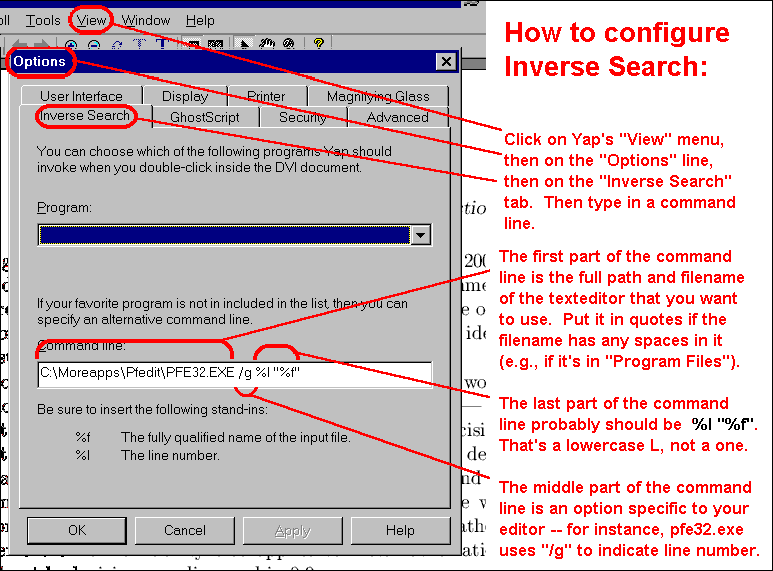 Inverse search. The use of this feature is explained in my introduction to tex programs. It is configured in Yap, but it must be configured differently for different text editors or shell programs. Here are some of the configuration lines for editors that I've tried. (You may have to change the directory paths if you've installed one of these programs in a directory location different from mine.)
