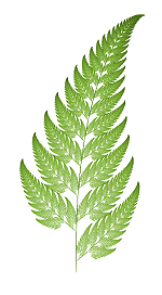 z0 = 0, zn+1 = zn2 + cdoes not tend to infinity. Iterative applications of simple rules produce many amazing fractal images, and some of them strongly resemble images seen in nature. An example of this is Barnsley's fern, shown at left.